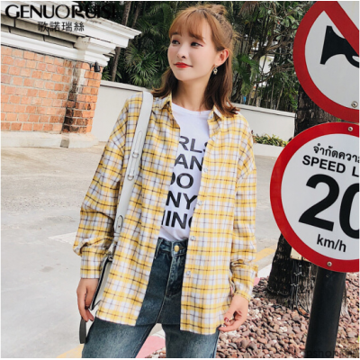 商品名称:歌诺瑞丝衬衫女2018春季新品休闲宽松长袖格子打底上衣潮-NV10302 黄色 L