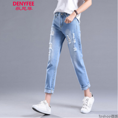 商品名称:TPshop 荻尼菲夏季牛仔裤女2018新款时尚高腰牛仔九分破洞哈伦女裤