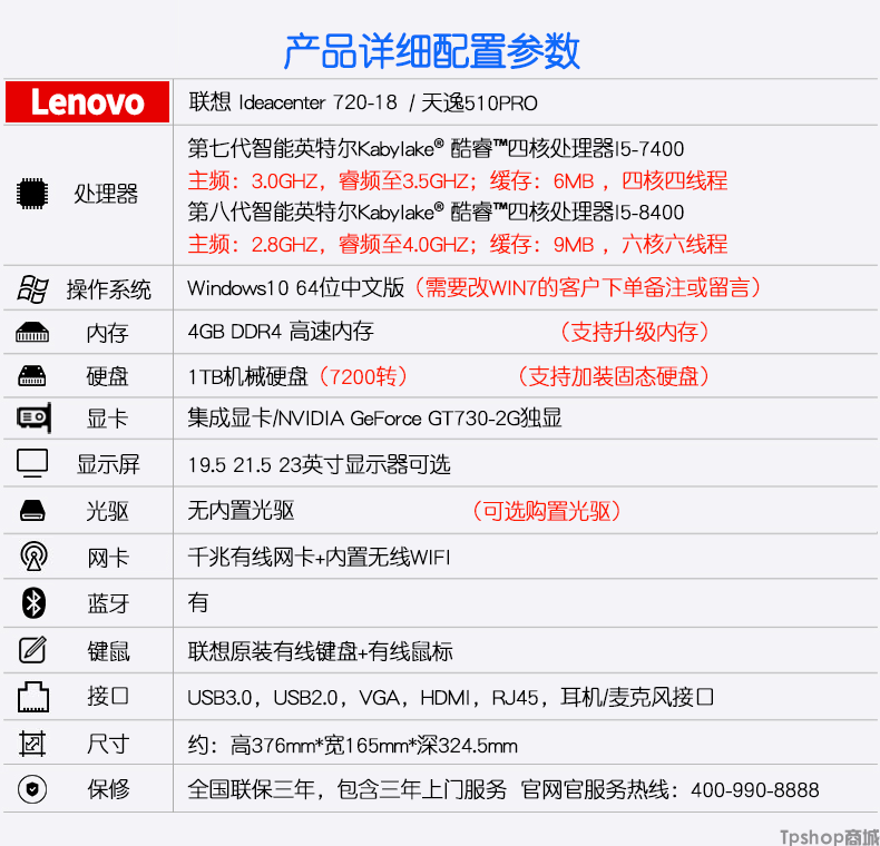 商品名称:TPshop 联想电脑台式机X315/510Pro/T4900V六核I5-8500 8G1T 2G主机整机