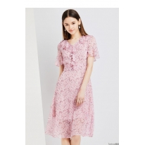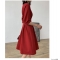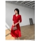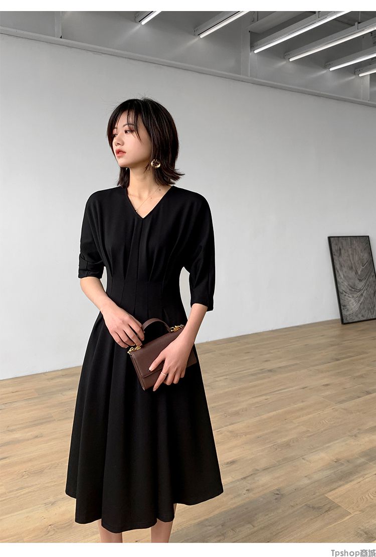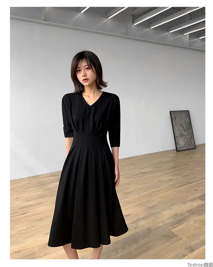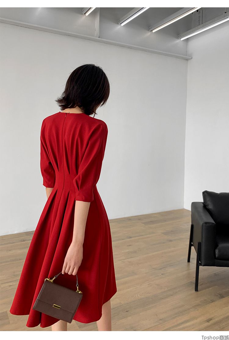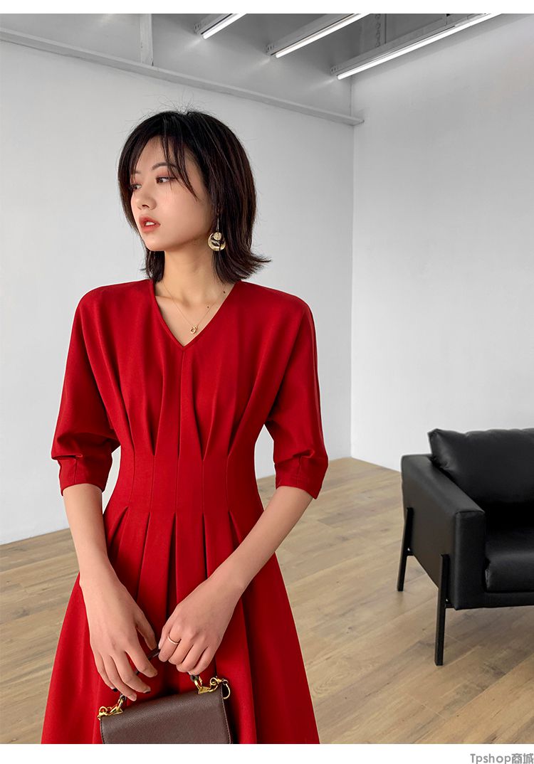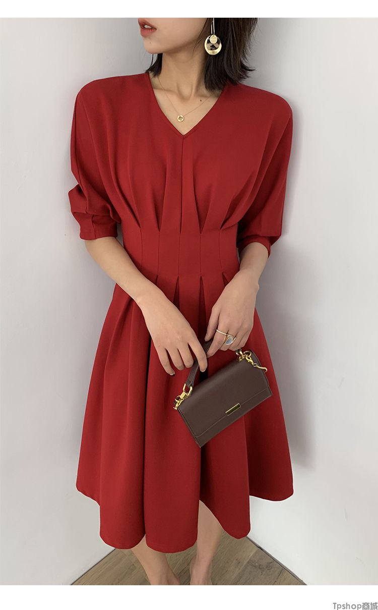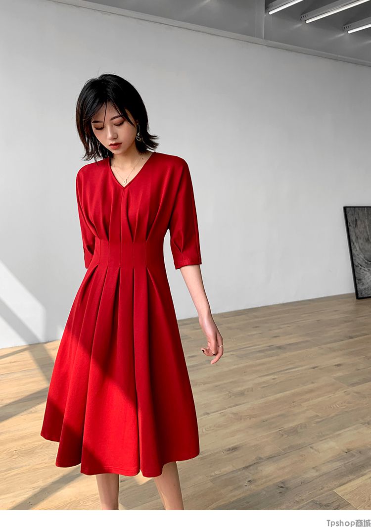 商品名称:TPshop 红色V领中长款收腰A字裙2019春夏款时尚气质过膝五分袖百褶连衣裙