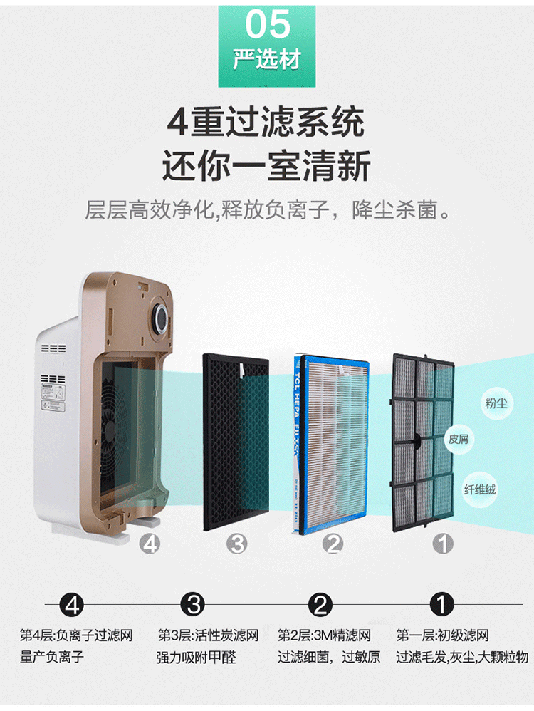 • 工作原理: :活性炭 负离子 HEPA技术