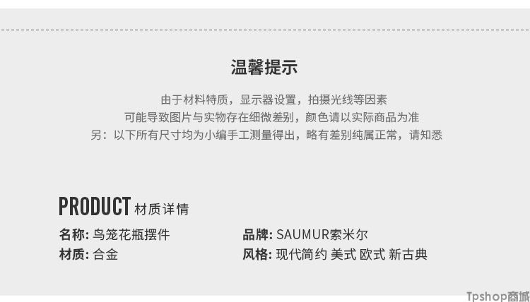 商品名称:TPshop SAUMUR鸟笼软装饰品黄铜金属简欧式家居客厅轻奢美式样板房间摆件