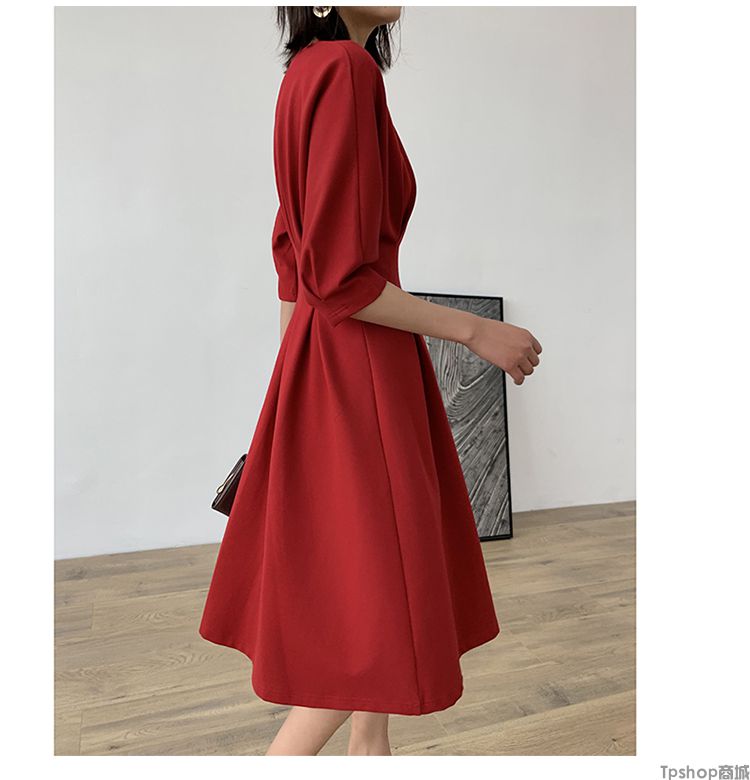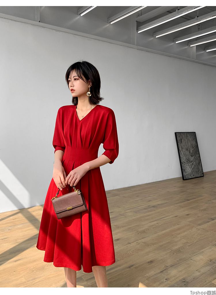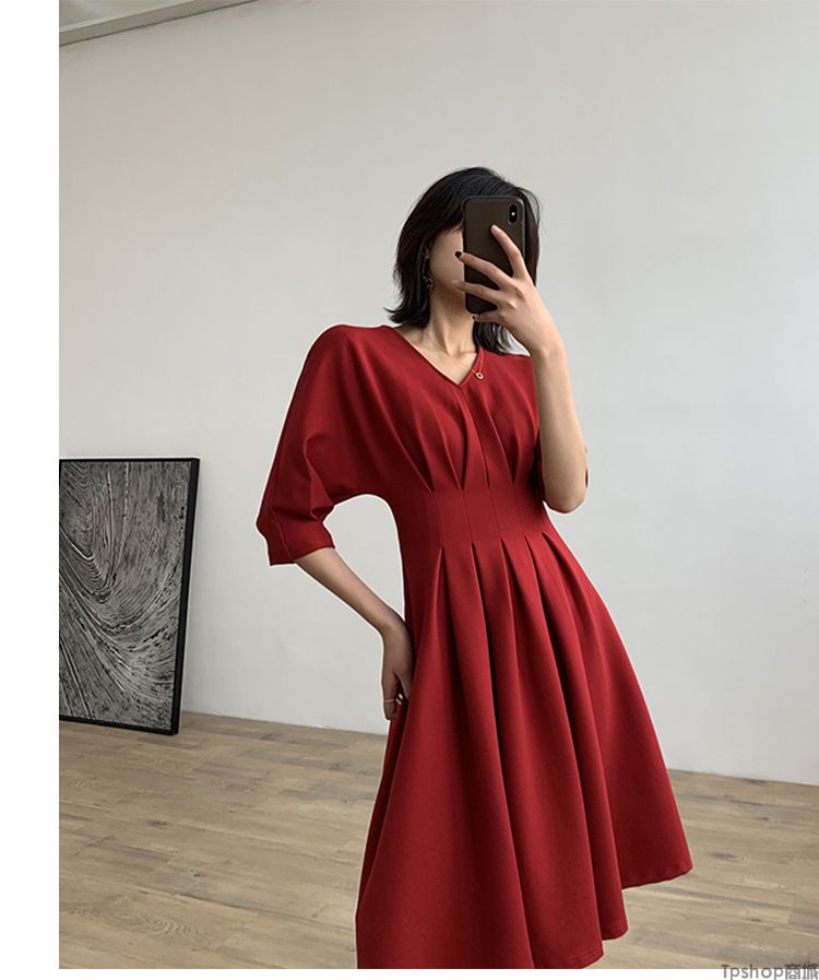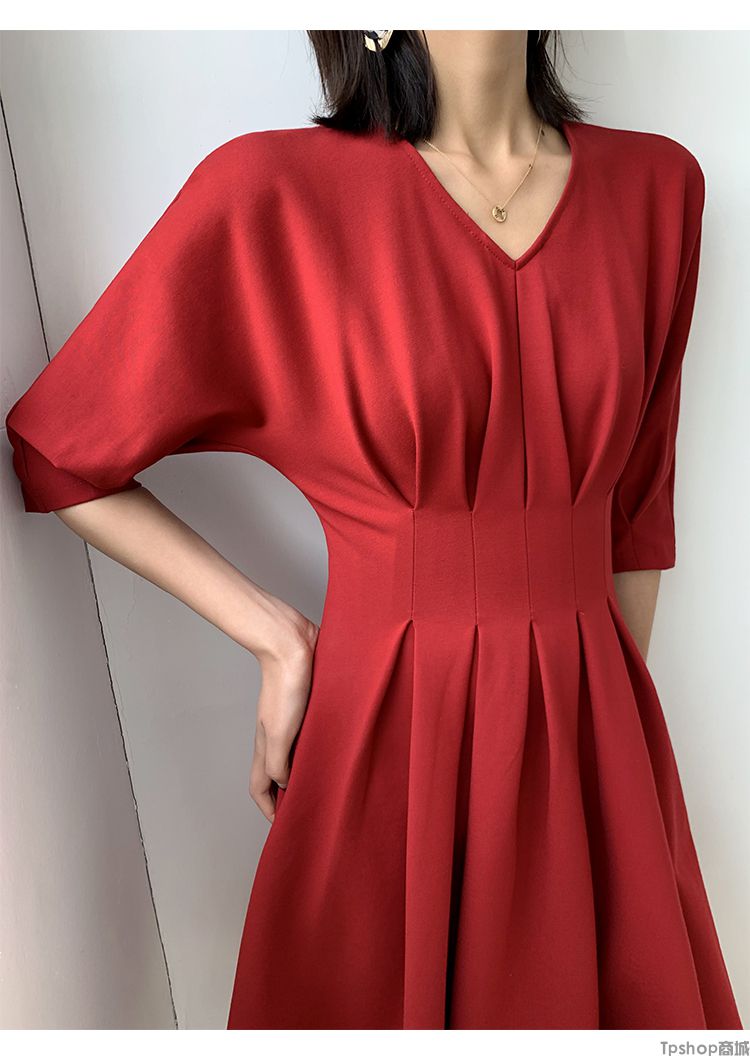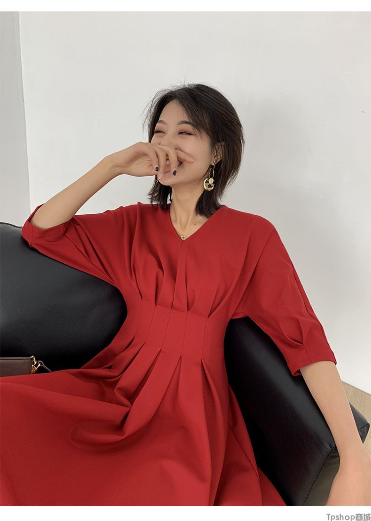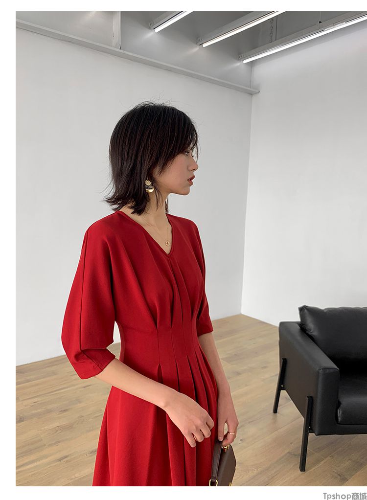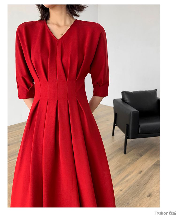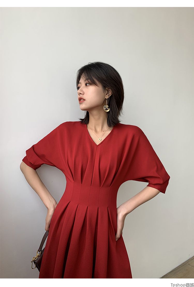 商品名称:TPshop 红色V领中长款收腰A字裙2019春夏款时尚气质过膝五分袖百褶连衣裙