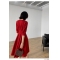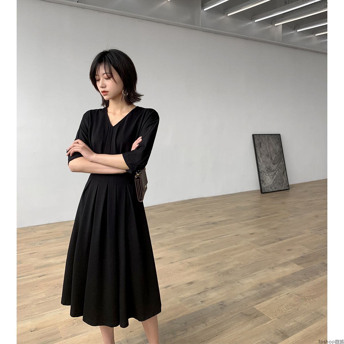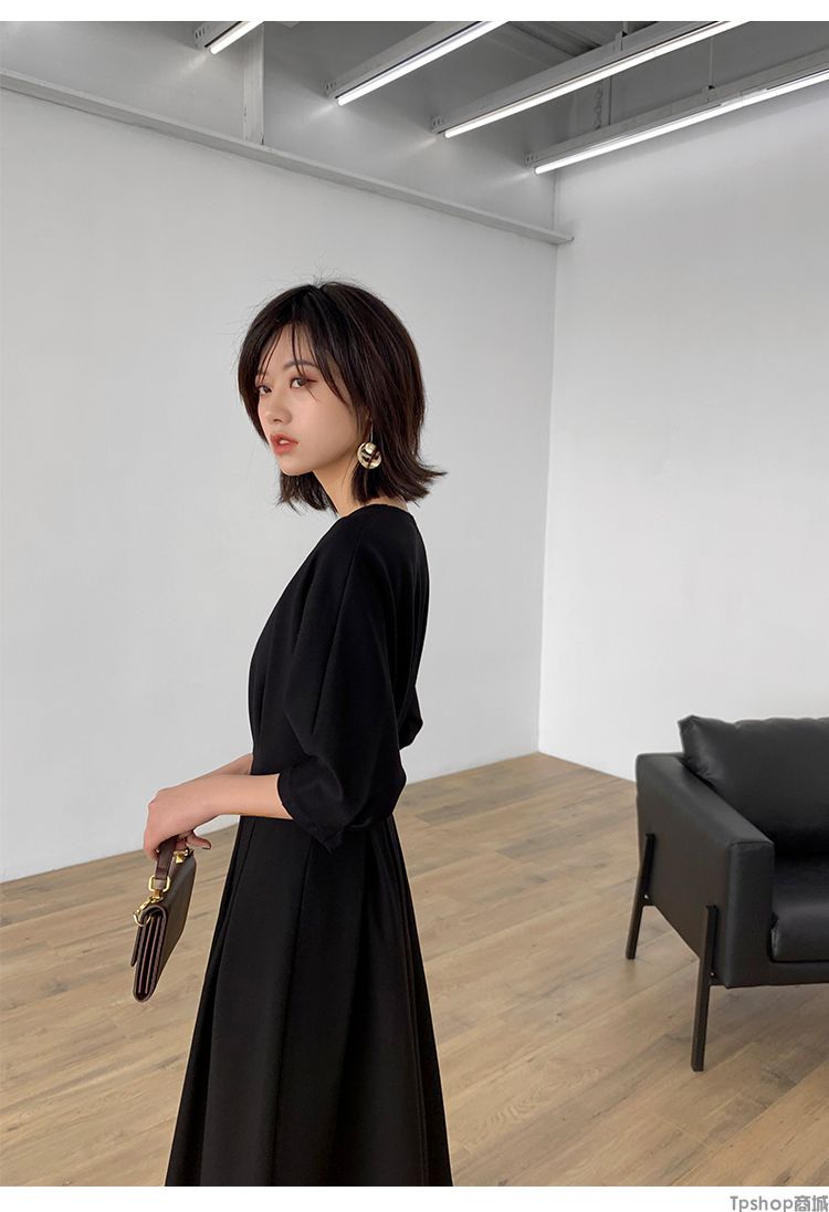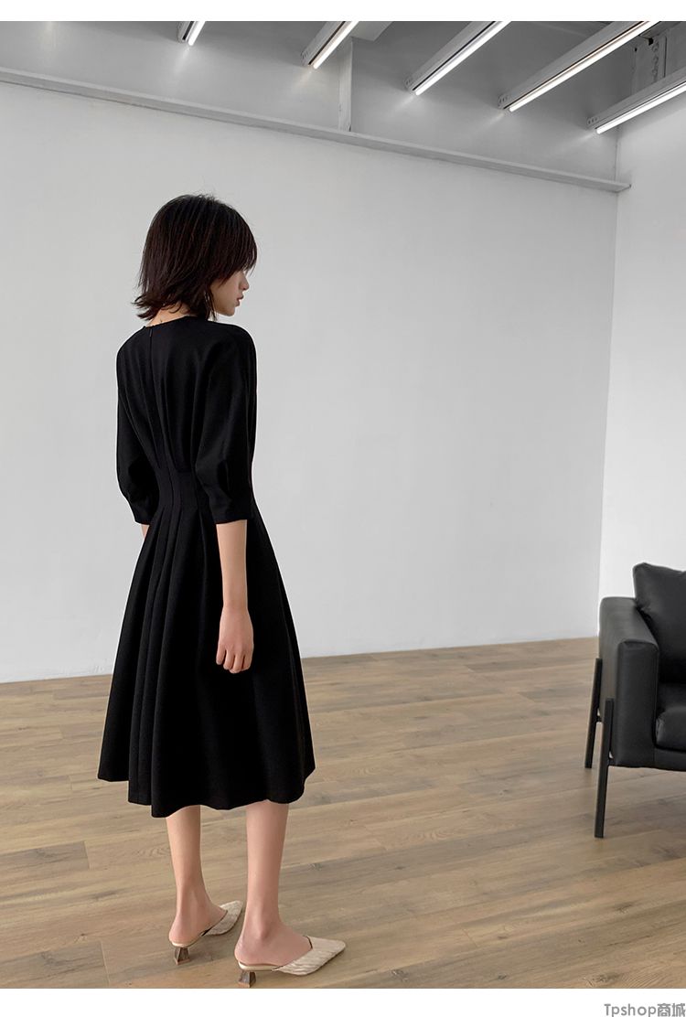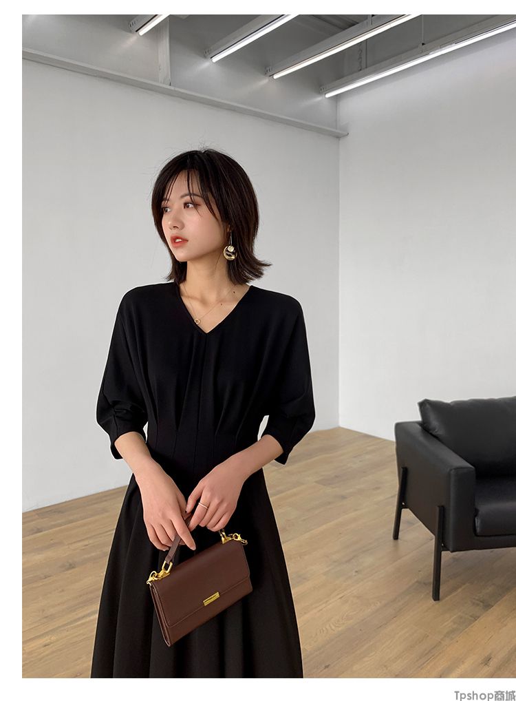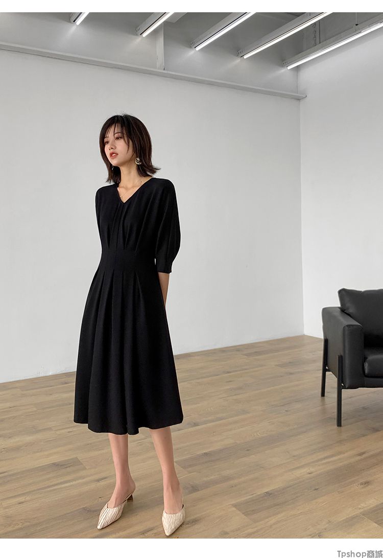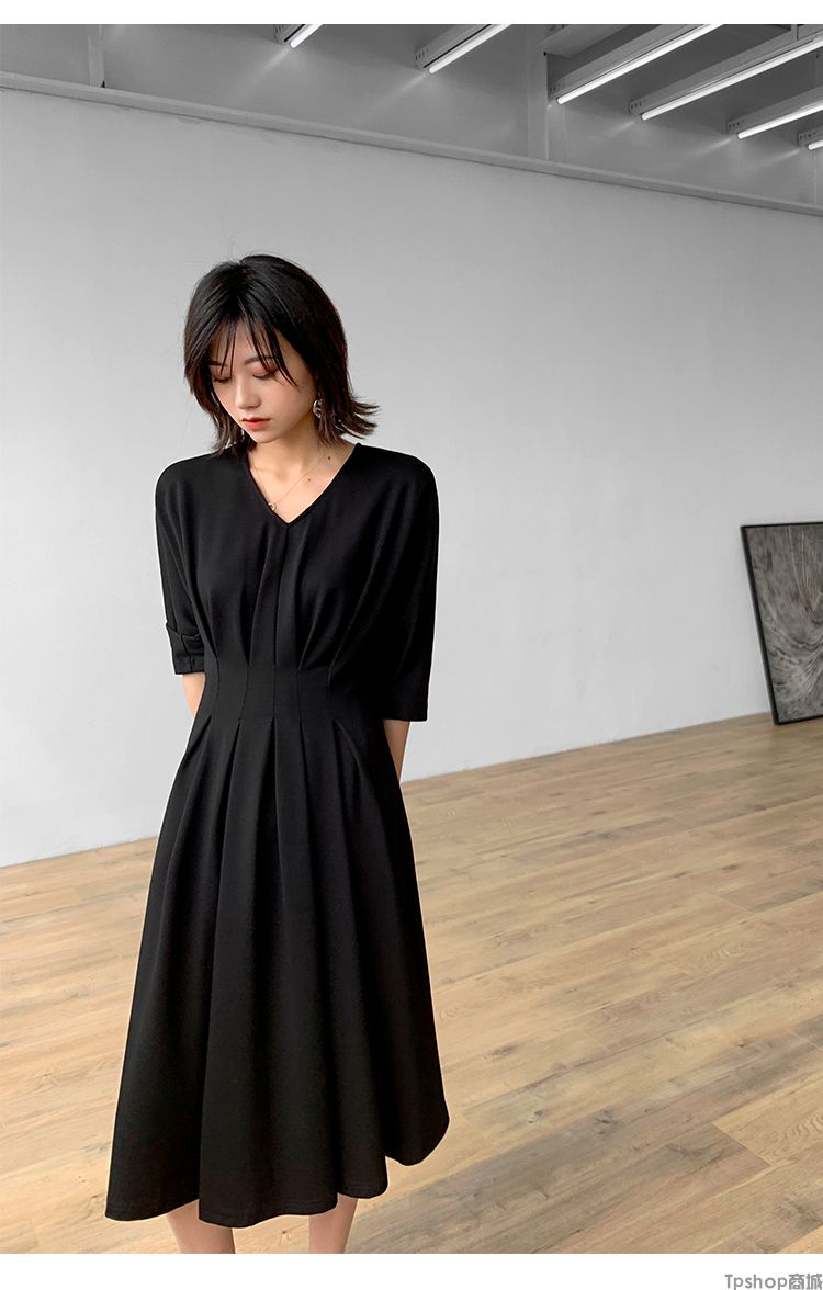 商品名称:TPshop 红色V领中长款收腰A字裙2019春夏款时尚气质过膝五分袖百褶连衣裙